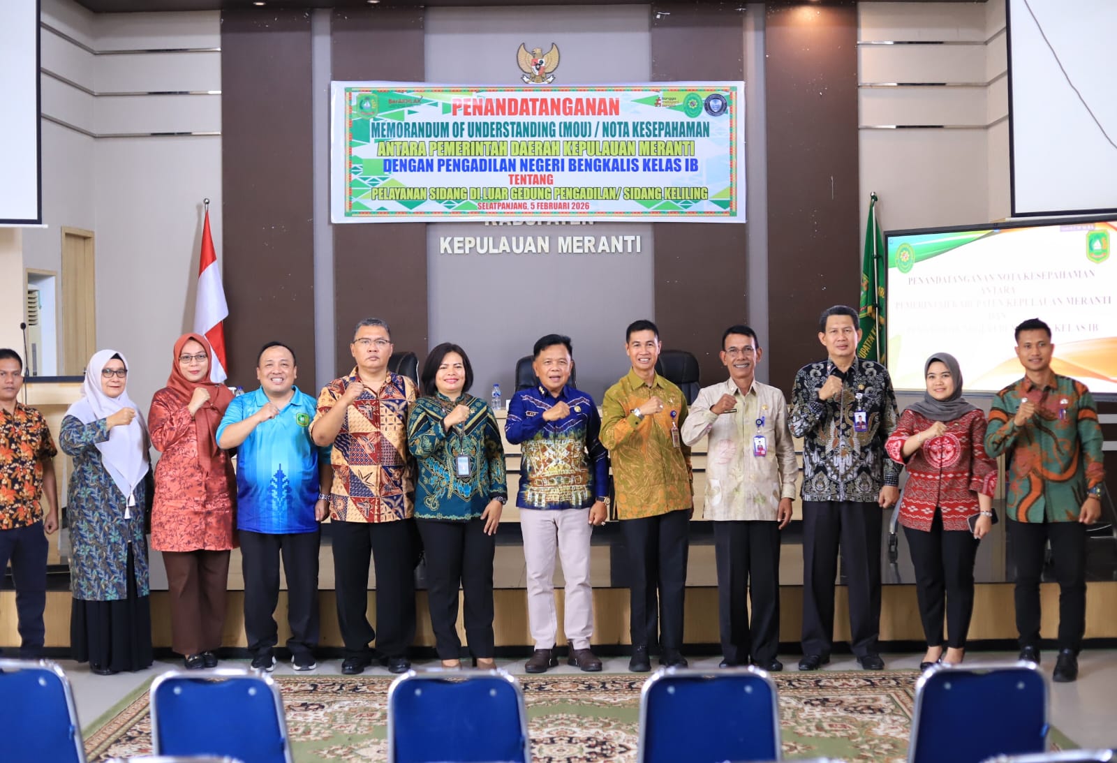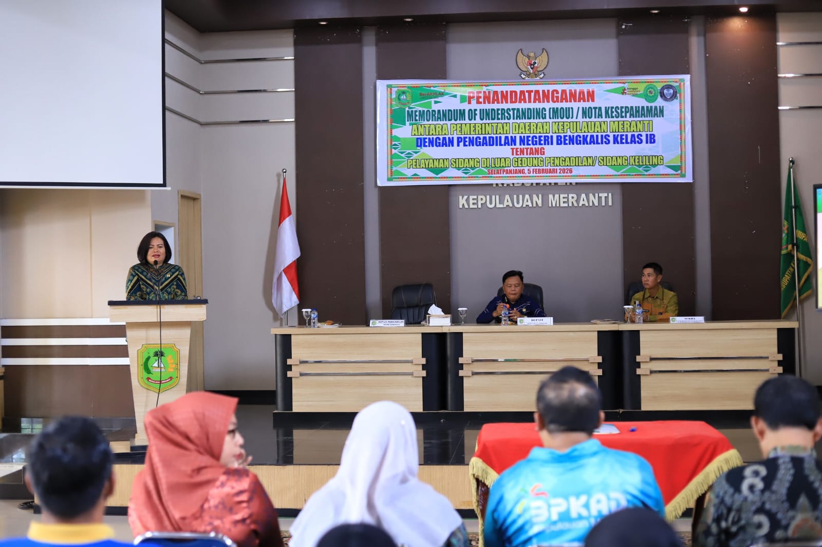 KEPULAUAN MERANTI, BEDELAU.COM--Pemerintah Kabupaten Kepulauan Meranti dalam hal ini Bupati AKBP (Purn) H. Asmar dan Ketua Pengadilan Negeri Bengkalis Lenny Lasminar, SH,. MH, melakukan penandatanganan Memorandum Of Understanding (MoU) tentang pelayanan sidang diluar gedung pengadilan (Sidang Keliling), dengan telah dilakukannya kesepakatan itu, warga Kepulauan Meranti tidak perlu jauh bersidang untuk mencari keadilan, bertempat di Aula Kantor Bupati, Kamis (5/2/2026).