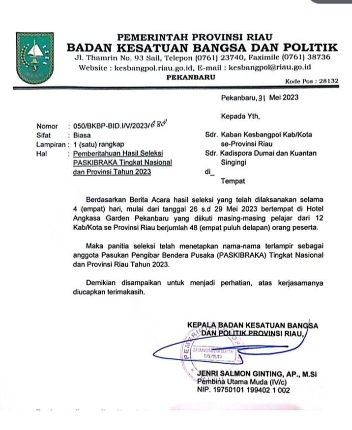 Sebagaimana diketahui, penetapan empat orang anak Meranti sebagai Anggota Paskibraka tingkat Provinsi Riau dan Nasional itu tertuang dalam pemberitahuan Badan Kesatuan Bangsa dan Politik Provinsi Riau dengan nomor 050/BKBP-BID.I/V/2023/688.